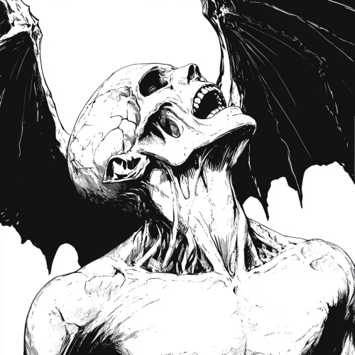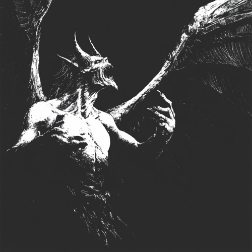 demonic demon with wings looking up and arms are out waiting to catch something in his hands, simplified illustration, black background, high contrast,