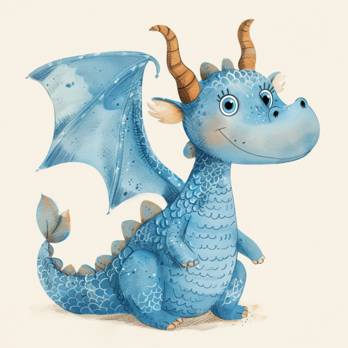 French-style children's illustration, featuring a full-body blue dragon with shiny scales and large wings, with no text. High quality and high resolution, with soft colors. --v 6.0