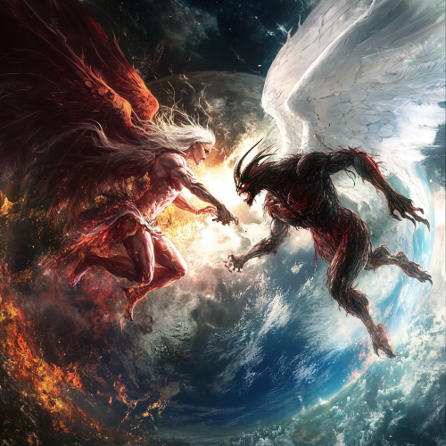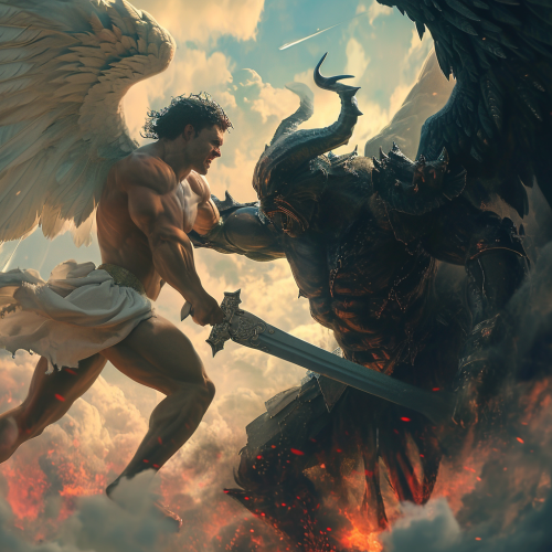 big Caucasian muscular angel with wings and a sword fighting a black demon with torn wings and an axe the battle takes place in heaven, realistic, cinematic, 8k, --v 6.0