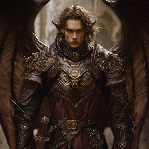 Devious and dangerous Fallen Archangel warrior, about 18 years old. He looks like Paul Dano. He has massive bat/demon wings. He is wearing elaboratw maroon renaissance armor with bull-motif. Epic. Dark Fantasy. Baroque style.