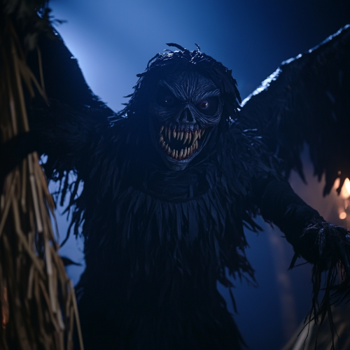 demon scarecrow with wings, claws, large, flies over farm, night, his horrible face very close to the screen, realistic style horror movie, 4k, photography
