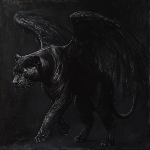 A painting of a panther with black feathered wings in an all-black style, showing its full body in a dynamic pose. The panther's muscular form is highlighted through subtle lighting, emphasizing its powerful muscles and sleek build, while its large, black feathered wings extend gracefully from its back. The wings are detailed with individual feathers, blending into the darkness while still visible through soft, faint highlights. The background remains dark and minimalistic, enhancing the focus on the panther's majestic form with wings, creating a sense of strength, mystery, and a mythical, otherworldly atmosphere.
