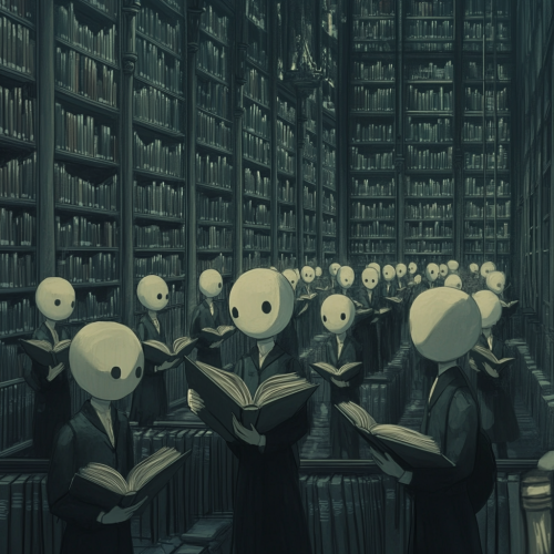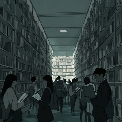 A large, dimly lit library filled with rows of tall bookshelves, everything in muted shades of grey. All students in the room are holding grey books, but they have stopped reading and are turning their heads or bodies to stare directly at one specific student. The expressions of all the other students are focused on that single student, creating an intense, unified gaze. The scene is entirely grey and somber, with a clear focus on the one student receiving all the attention.