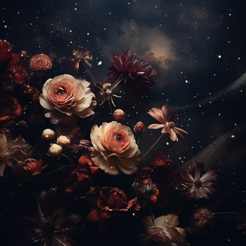 flower aesthetic. Dark colour palette. Space. Mysterious. Stars. Beautiful. Captivating. Interesting