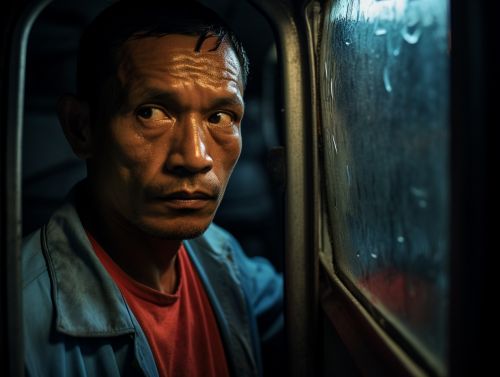 a filipino man in his 40s with an outfit of a jeepney driver is staring at himself in the mirro, horror, eerie, unsettling, sinister --ar 4:3