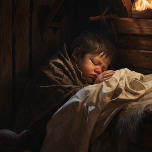 a crying newborn male baby wrapped in a bearskin, hidden under the bed in a medieval hunter's hut
