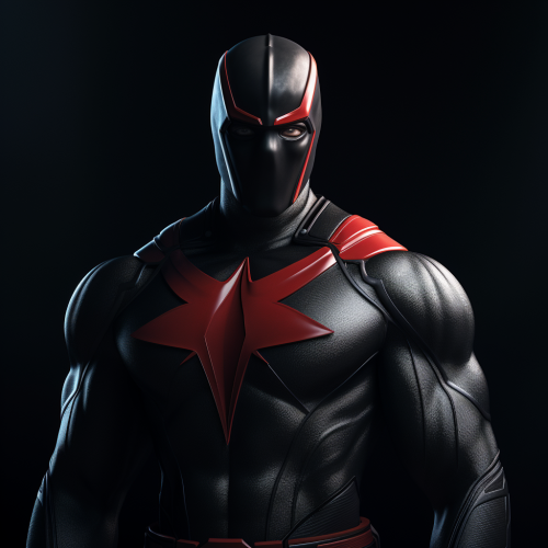 male super hero in a black costume with a red 'T' logo on his chest with a face mask like captain britain