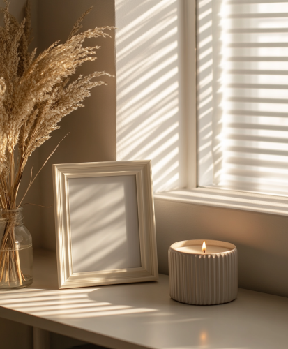 photograph of an empty upright rectangular photo frame on a home office desk, next to it a candle. The room is decorated in neutral tones, creating soft lighting that evokes a warm atmosphere. Sunlight streams through the window, casting gentle shadows across the space. This image conveys a serene moment , captured with a Canon EOS R5 mirrorless camera --ar 5:6