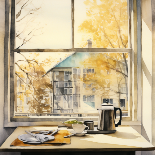 a calm scenery watercolour and abstract painting of a kitchen window in winter, coffee on the table, ink outlines, yellow tablecloth, grainy, brushtrokes