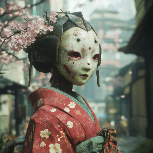 Japanese space alien Yokai, Cherry Blossam fairy,Edo period, Rough cityscape in the background,seriously injured face, Shooting below the neck.,Unreal Engine, Super-Resolution, Ray Tracing, high resolution photography, 4k, studio photo, elegant--ar 3:2