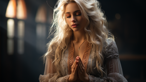 A regal young woman stands in a snow-covered forest, slightly offset to the right of the frame, her piercing blue eyes maintaining a direct, captivating gaze. Her blonde hair is styled in an elegant updo with loose strands, adorned with delicate pearls that glisten like the falling snow. She wears an opulent, high-collared coat with intricate golden embroidery and embellishments, exuding a sense of nobility and grace. Snowflakes gently fall around her, and the background is filled with tall, blurred trees fading into a misty, wintry atmosphere, adding depth and a mystical quality to the scene. The cold, ethereal environment contrasts with her warm expression, creating an image of a powerful, enigmatic figure commanding her magical winter domain. Cinematic film still, shot on v-raptor XL, film grain, vignette, color graded, post-processed, cinematic lighting, 35mm film, live-action, best quality, atmospheric, a masterpiece, epic, stunning, dramatic --ar 16:9 --fast --style raw --personalize kwgh21a --stylize 400 --v 6.1