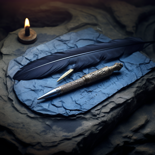 not a pencil but An ancient quill pen writes a test on a stone. blue and gray background.