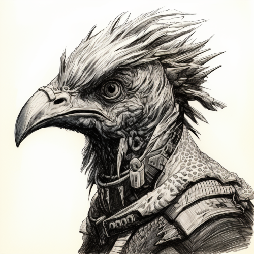 portrait sketch of a beak-faced mutant human brigand, pen and ink, style of victor leza