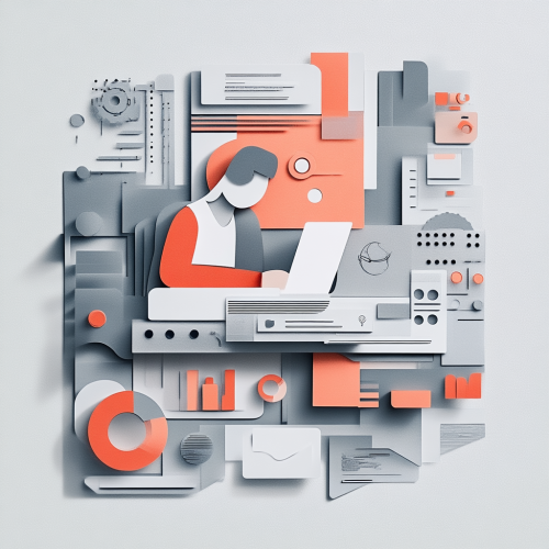 A paper cut craft illustration representation of A paper cut craft illustration of a person coding on a laptop, surrounded by abstract shapes representing coding challenges. The background is in light gray color. --ar 1:1 --quality .5