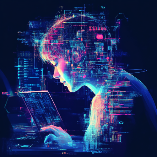 A diagrammatic portrait representation of A diagrammatic portrait of a person intensely focused on a computer screen, surrounded by abstract representations of coding challenges. The background should be a gradient of dark blue and light blue, with no text. The person should be depicted in a thoughtful pose, with elements like code snippets, algorithms, and data structures floating around. Use colors dark blue and white to emphasize the tech theme. --ar 1:1 --quality .5