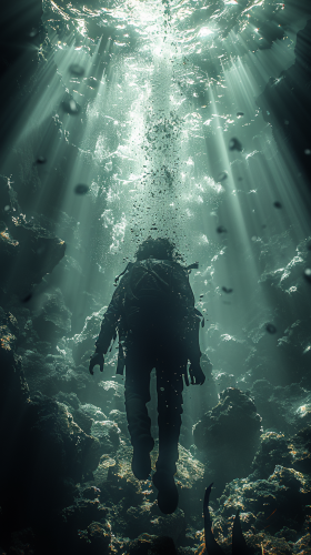 a human disintegrating underwater as he approaches the abyss, dark lighting, epic wide shot, 3D Pixar style --ar 9:16 --s 750