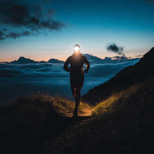 The person wearing a headlamp is running on the mountain late at night. The headlamp emits light, which should not be too exaggerated. wallpaper. --style raw