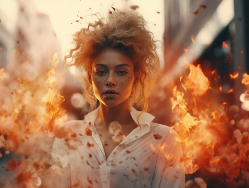 shutter speed ¼ double exposure photography of beautiful woman, hyper realistic, uneasy feeling with swirl of flowers and fire walking down a white city --ar 3:4