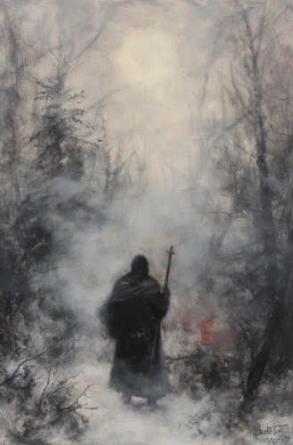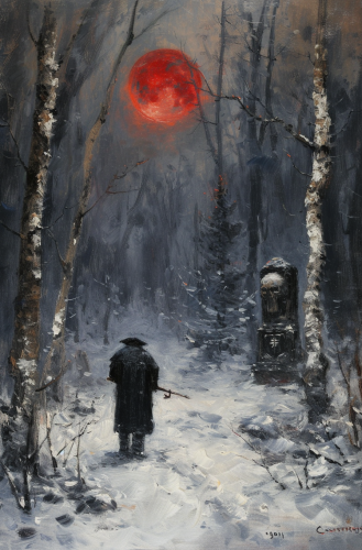 Oil painting by JOHN CONSTABLE of a priest in foggy northern forest holding a short shotgun at a norse totem, red full moon, snow on the ground, horror, uneasy feeling --ar 49:74 --v 6.0
