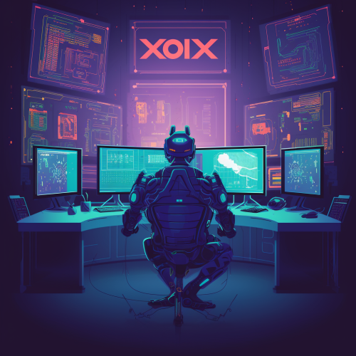 0x Bot logo depicting a robot sitting at a trading desk, surrounded by multiple screens displaying trading signals, the '0x' symbol integrated into the scene, colorful and dynamic atmosphere representing a bustling trading environment, illustration, contemporary style, --ar 1:1 --v 5.0