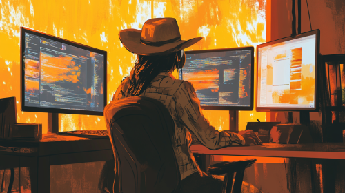 Generate a digital art for A digital art scene showcasing a futuristic workspace with multiple computer screens displaying code in various programming languages. The background is dark with neon highlights in black. The atmosphere is vibrant and tech-savvy, emphasizing the importance of programming skills in 2024. No text on background. --ar 1:1