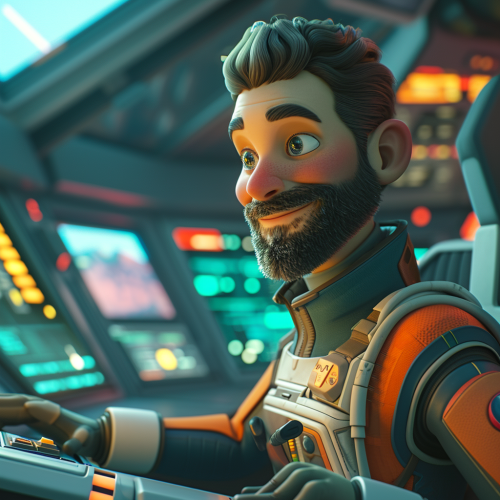 An animated pilot character with a small beard embarks on a high-tech adventure through the digital realm. As he soars through virtual landscapes, he encounters coding challenges and AI puzzles. In his trusty cockpit, surrounded by futuristic screens, he becomes the coding mentor for aspiring tech enthusiasts --v 6.0