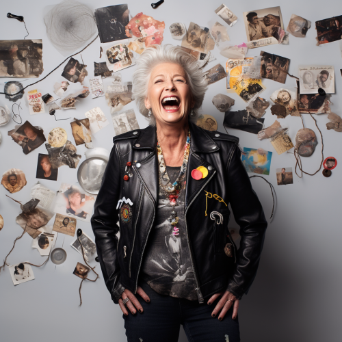 A portrait of a 60 year old woman wearing a black leather jacket, pleased at her life full of happy memories and experiences, in a photography studio against a white background, the background contains a montage of key memories and objects from her life emanating from behind her, three quarter shot, joyful and colourful mood