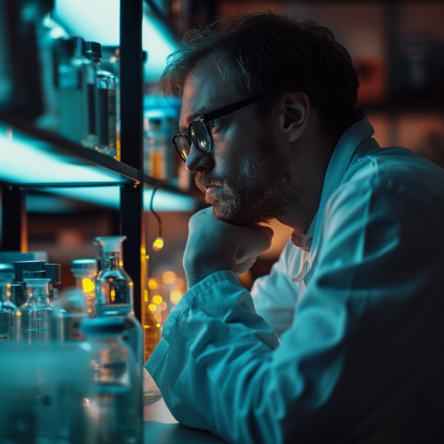 a pharmacist thinking about a new medicine formula in his lab 8k hd reality --v 6.0