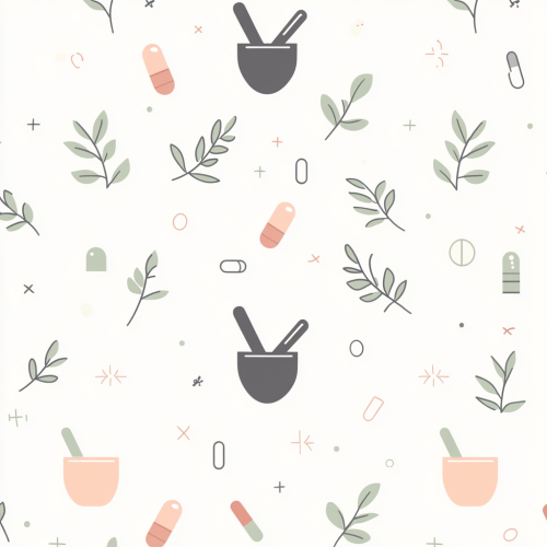 Create a seamless, repeating pattern for a business card design representing a pharmacists' association. Use symbols related to pharmacy and medicine, like mortar and pestles, capsules, and botanical elements, incorporating clean lines and soft colors for a professional yet welcoming look. The pattern should be minimalistic, with a balanced mix of pharmacy symbols and subtle geometric shapes. Make sure the design is light and unobtrusive to allow for easy readability of text overlay. High resolution, in a modern and elegant style, perfect for a professional business card background