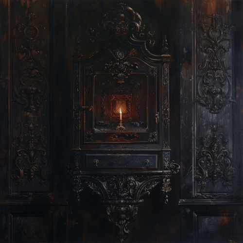 : An ornate, antique cabinet with a deep, dark finish, surrounded by shadows, with one drawer glowing from within, symbolizing hidden power, mystery, and the unknown. Art Style: Gothic Realism --v 6.0