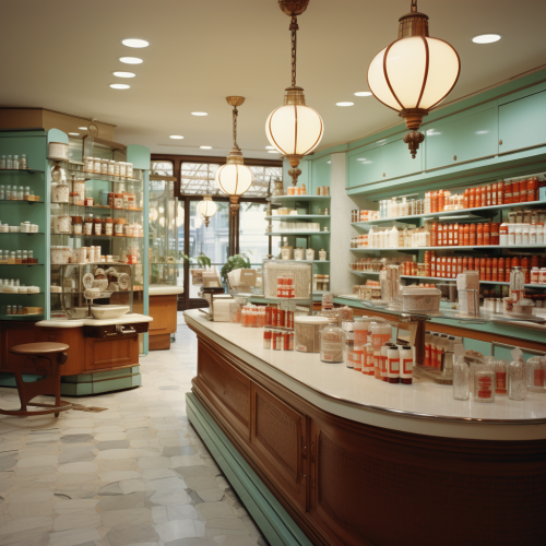 editorial photo of a pharmacy interior design from a famous design book. Small contemporary pharmacy, one pillar on the left side --s 250
