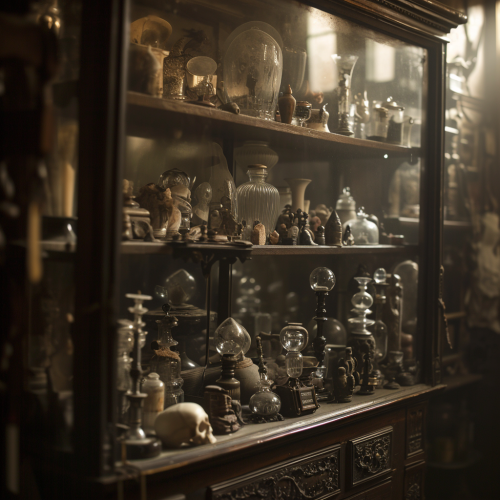cinematic from the movie from hell by tim burton, Cabinet of Curiosities: Imagine a Victorian cabinet of curiosities filled with esoteric objects. Band members could be depicted exploring this strange place, discovering mysterious and macabre artifacts. dark and smoky light --v 6.0