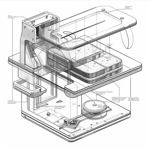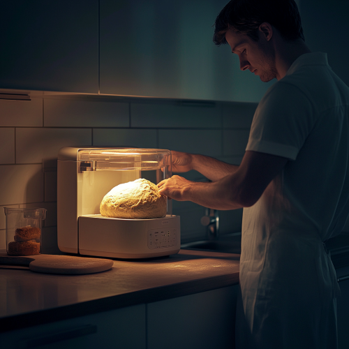 A realistic photo of a 40 years old male in his kitchen at night, putting a bread dough, totally frozen, in a bread machine. The machine looks like a big nespresso machine. The machine is on his kitchen counter.