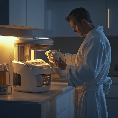 A realistic photo of a 40 years old male in his kitchen in nightrobe, using a futuristic countertop bread machine that looks a slightly bigger nespresso machine. We can see the male putting a frozen bread dough in the machine.