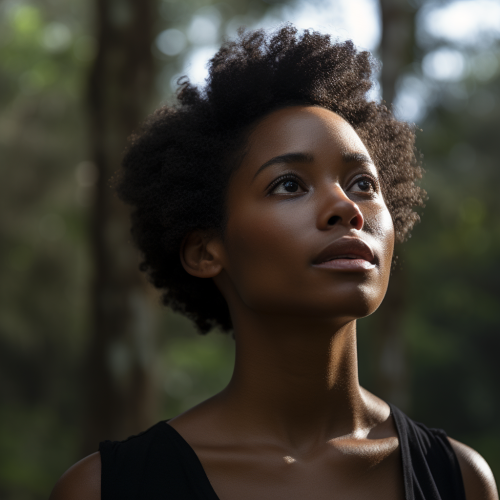 photograph of a black woman outside, head and shoulders, looking slightly to the side, bright, photorealistic