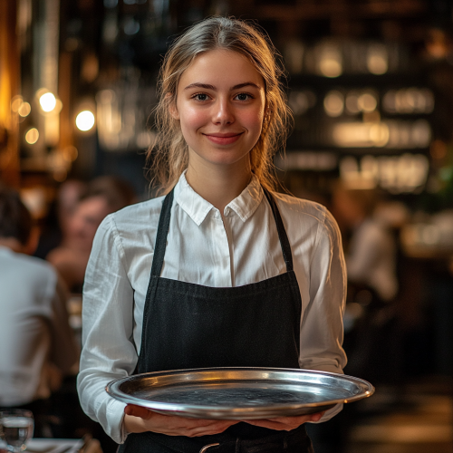HD quality. A friendly waitress stands behind a hight table in a cozy restaurant and smiling at the camera. She is wearing an elegant uniform with a white blouse and black apron. She is holding a silver tray. In the background, a few guests are visible, watching what is happening with interest. The picture exudes a warm, but at the same time quirky atmosphere.