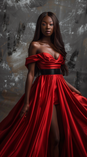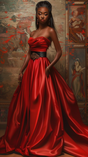 a full body photorealistic image of a very beautiful thin African American woman. The woman is the princess of the most powerful country on an earth-like planet. The woman is 24 years old and is wearing a flashy red dress with a black belt. The dress is satin. The woman has beautiful long hair, --ar 9:16 --v 6.0