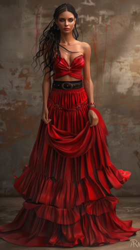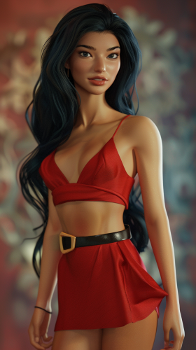 a full body photorealistic image of a very beautiful thin hispanic woman. The woman is the princess of the most powerful country on an earth-like planet. The woman is 44 years old and is wearing a short red dress with a black belt. The dress is satin. The woman has beautiful long hair, --ar 9:16 --v 6.0