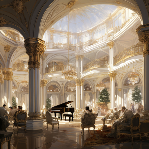 large fantasy white regal common room, musicians playing, ornate vaulted ceilings, french elegant and refined, seating areas with couches, columns, chandelier, wealth, lots of light, gold accents, royal palace, highly detailed --v 5.2