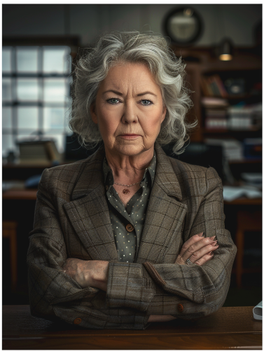 A friendly and professional-looking veterinarian, a middle-aged woman, sitting in a well-lit, modern veterinary office. She is smiling warmly at the camera, conveying trust and care. The background should be softly blurred, with hints of medical equipment and pet posters, emphasizing a clean and welcoming environment. The vet should be centrally framed to fit within the dimensions of a smartphone screen, focusing on her upper body and face.