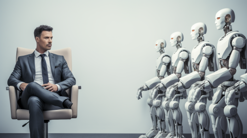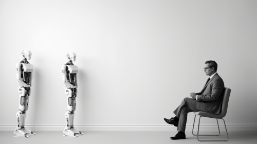 a professional stock image, a Man, and an AI robot waiting for a job interview, Two chairs were sitting in a row of white office chairs for a job interview. A white wall behind. --ar 16:9 --v 5.2