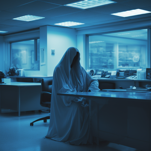 a hospital ward watcher. A magic monk wearing a hooded robe at a job interview. The setting is a dull office. The colour filter is blues