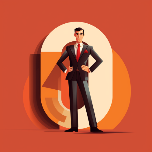a corporate logo featuring a cartoon of a tal lbald man in a suit leaning against the final letter