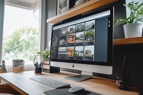 Realistic photo of a computer screen showcasing real estate details, featuring multiple property images and descriptions, set on a stylish desk with organized decor, capturing a modern and professional workspace. Photorealistic, realistic image, 8K resolution --ar 3:2 --v 6.1 --style raw