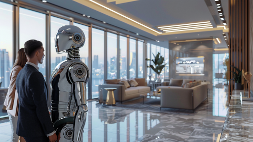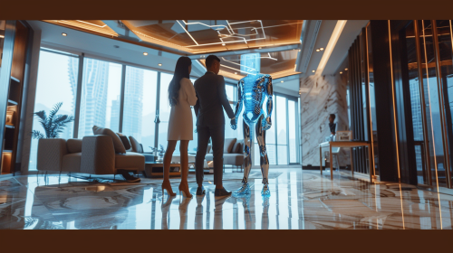 A close-up shot of a full AI robot consulting a couple inside a luxurious real estate office. The robot, with a futuristic chrome finish and human-like features, is standing closely beside the couple, actively presenting property details on a transparent holographic display. The couple, dressed in formal attire, listens intently, with the robot’s hand gesturing towards the hologram. The background subtly shows the office's marble floors and large windows with cityscape views, but the focus is on the interaction. Warm lighting enhances the professional and intimate atmosphere. --ar 16:9