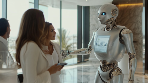 A full AI call bot consulting with a couple inside a luxurious real estate office. The bot, with a futuristic chrome finish, is presenting property details on a transparent holographic display. The couple, dressed in formal attire, looks engaged while the office setting features marble floors, large windows with cityscape views, and modern furniture. Warm lighting creates a professional atmosphere. --ar 16:9 --v 6.0