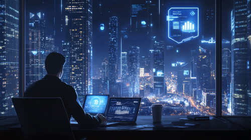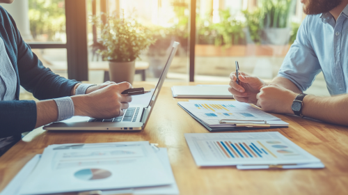 Create an ultra-realistic image of a professional property advisor consulting with a client in a modern, elegant office or high-end real estate environment. The advisor, dressed smartly, is engaged in a meaningful conversation, reviewing documents or property plans with the client, symbolizing expert guidance. Surround them with subtle but luxurious elements--such as a laptop displaying real estate data, upscale furniture, a coffee cup, and financial documents on the table. The setting should convey trust, sophistication, and financial success, with natural light pouring through large windows. Use a color palette with neutral tones, deep blues, and gold accents to evoke professionalism and prosperity. No text should be included. --ar 16:9 --v 6.0 --s 750