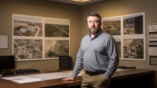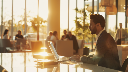 A high-quality photograph of a sleek, modern real estate office, focused on a confident real estate agent reviewing offers, their desk filled with paperwork and a glowing laptop screen. The background shows blurred figures of eager clients waiting in a stylish, open-concept office. The scene is lit with natural sunlight streaming through large windows, creating a warm, inviting atmosphere. The composition is sharp, vibrant, with a hint of corporate professionalism, Canon EOS R5 camera, 50mm lens, golden hour lighting, fine detail, commercial look --ar 16:9 --v 6.0