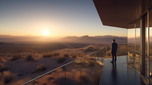 Cinematic photograph of an individual standing on a luxurious real estate terrace, overlooking an expansive desert with rugged mountains in the distance, as the first light of dawn illuminates the scene. The sunrise casts golden hues over the sandy dunes and creates long shadows from the cacti and desert flora. The terrace boasts modern architecture, with sleek lines and glass railings, contrasting with the wild, untamed beauty of the desert. The individual's attire hints at sophistication, perhaps a real estate mogul or a prospective buyer. Captured with a Sony A7R IV, using a 24-70mm lens, f/2.8, ISO 50, with a hint of lens flare from the rising sun. --v 5.0 --ar 16:9
