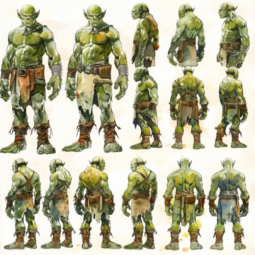 A watercolor painted-cartoon style character-design-sheet of many poses for a young adult male handsome half-orc with green skin. Consistent Character from many angles. --v 6.0